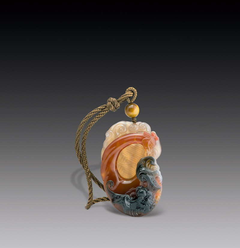 作者将传统题材和新颖理念巧妙结合,以红色长颈鹿谐“禄”,雕刻精致微妙,若对光观之,长颈鹿身上的藏色斑纹生动自然、栩栩如生,藏色技巧的运用恰到好处。黑色的蝙蝠寓“福”,精雕细琢、一丝不苟。作品整体呈佛手形状,“福、禄、寿”俱全,一件小作品生发出无限的吉祥寓意。