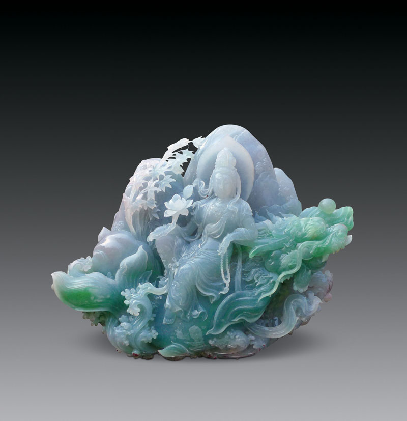 老坑玻璃种,质地凛洁,色泽碧透,借形施艺,精美绝伦,有如天遗瑰宝。观音形态优雅安详,手持莲花,慈祥传神。修坐鳌鱼俏色浓绿治琢,鳌鱼整身浓绿欲滴,设计精妙。