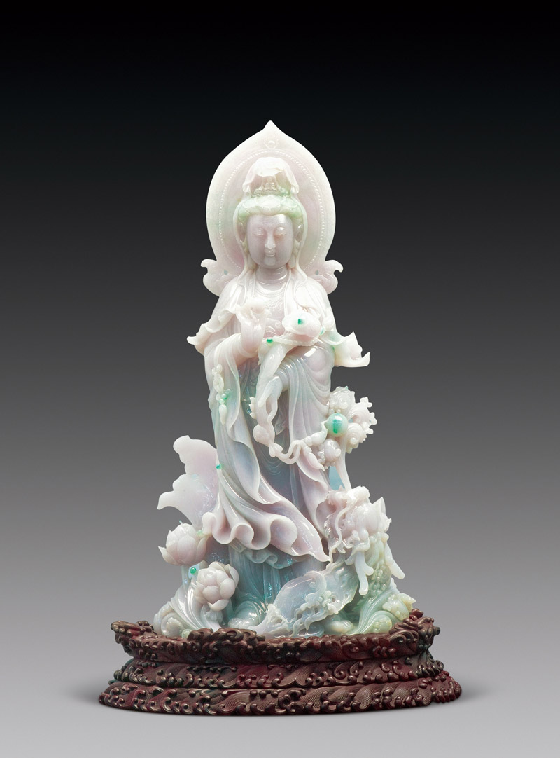 翡翠观音通体春色带阳俏绿,材质温润细腻,器形挺拔硕大,通体浑然天成无任何瑕疵。观音菩萨头戴阿弥陀佛宝冠,顶光火焰冉冉升起,宝珠熠熠生辉;右手持宝珠,左手托吉祥如意;脚下潺潺流水,盛开的白莲花在流水中傲然挺立。鱼龙戏水,巨龙昂首喷洒出的浪花托起翠绿宝珠在不停地转动。作品集我国南、北玉雕精细、大气的特点,工艺精湛,刀刀透露灵气,处处突显魅力。